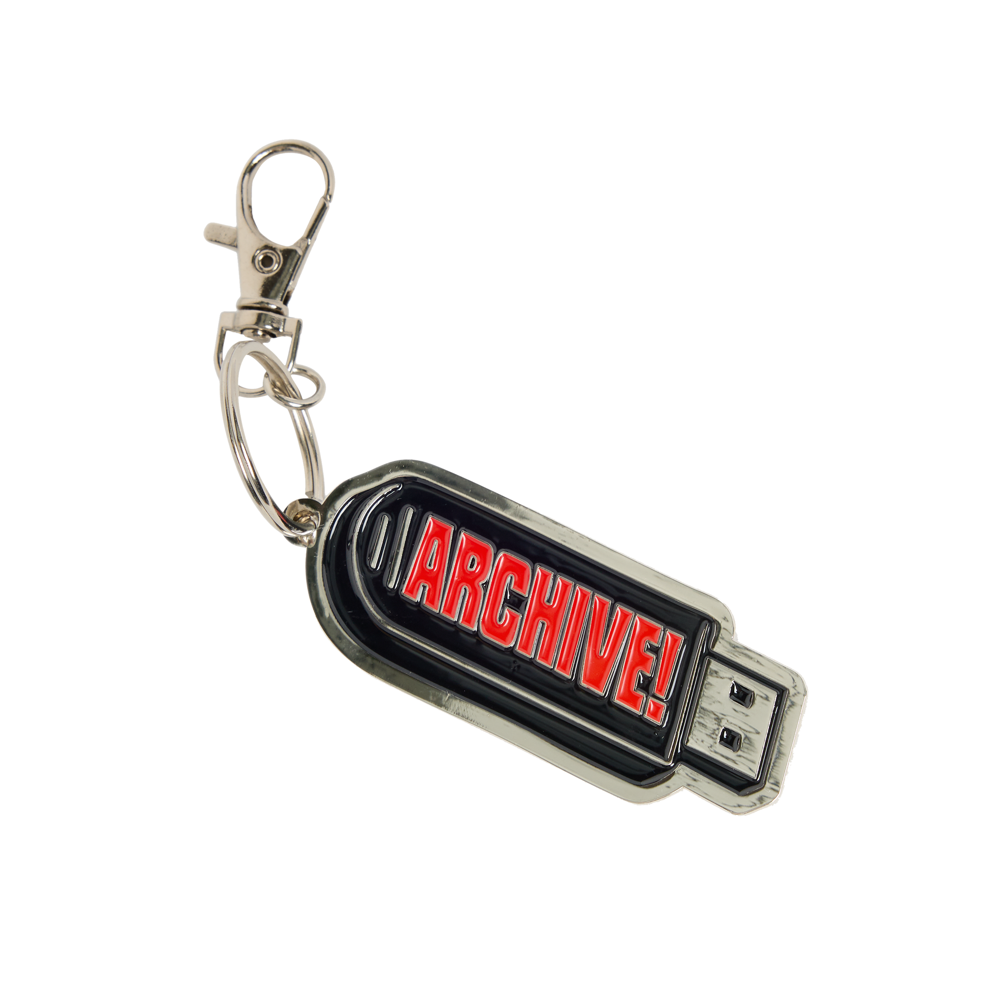 Steel keychain with enameled USB Archive graphic. Dimensions: a" x b" (c x d cm). This is a pre-order item, please allow 4-6 weeks for shipping.